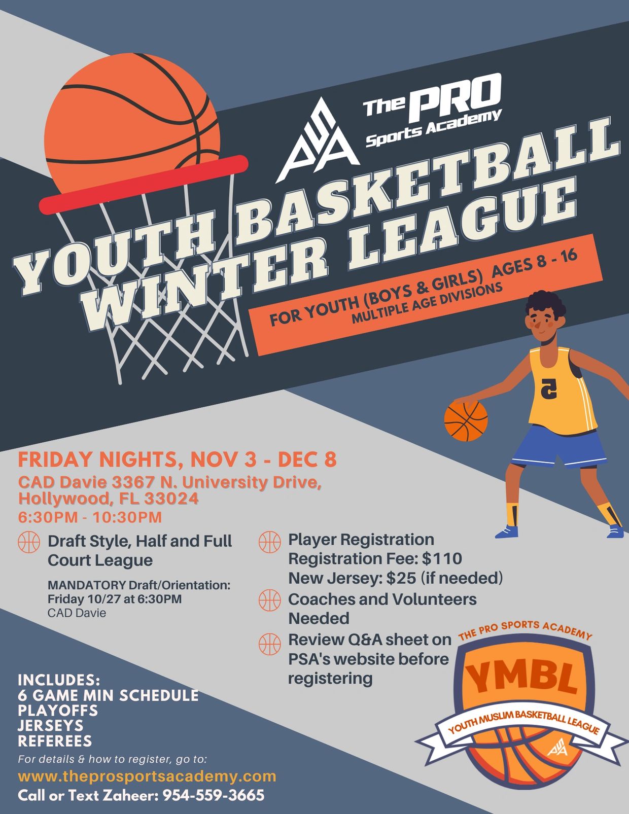 Welcome to the home of the YMBL. We're excited to kickoff PSA's Winter '23 Youth Muslim Basketball League (YMBL)! We're glad to have you on board. Please read through this Q&A before registering. If you have additional questions, please contact us at theprosportsacademy@gmail.com or call Zaheer @ 954-559-3665.